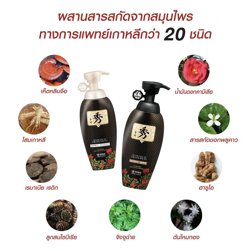 ด้วยสารสกัดหลักจากโสมเกาหลี และสมุนไพรธรรมชาติเกาหลีกว่า 20 ชนิด ช่วยลดผมขาดหลุดร่วง กระตุ้นการไหลเวียนโลหิต เห็ดหลินจือ เร่งการเกิดใหม่ของเส้มผม ลูกสนไซบีเรีย ช่วยเสริมสร้างความแข็งแรง เติมเต็มโปรตีนให้เกล็ดผม และมีน้ำมันดอกคามิเลียจากเกาะเชจู ให้ความชุ่มชื้น ด้วยโอเลอิค แอซิด เข้มข้นถึง 85% ช่วยฟื้นฟูผมแห้งเสีย กลับมาเงางามอีกครั้ง